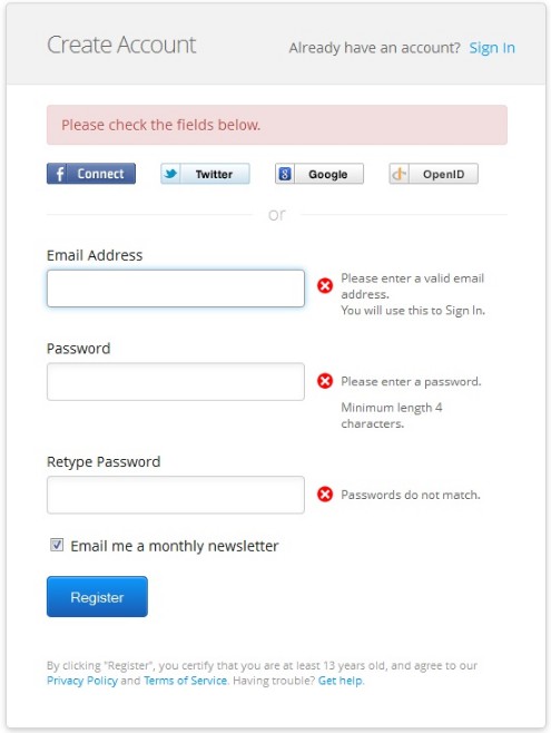 現(xiàn)在還有很多設(shè)計(jì)師開始將錯(cuò)誤提示做成文字標(biāo)簽形式,將其和控件放在一起。這樣子用戶就可以很容易的讀取錯(cuò)誤信息,一眼就能看出來(lái)哪里出錯(cuò)了,不用根據(jù)提示的控件名稱去尋找出錯(cuò)的位置,因?yàn)殄e(cuò)誤提示就在發(fā)生錯(cuò)誤控件的旁邊。此外還很容易改正,因?yàn)橛脩舨挥迷偬D(zhuǎn)頁(yè)面或去記那些冗長(zhǎng)的錯(cuò)誤信息。