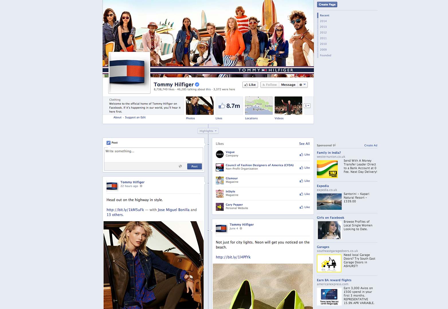 下面以Tommy-Hilfiger的Facebook頁面為例。這個美國潮牌的Facebook頁面有著870萬粉絲,如此眾多的粉絲都是Hilfiger品牌故事的忠實 聽眾。Hilfiger在頁面上分享設(shè)計、名人合作伙伴的照片和新聞以及各種宣傳活動,圖示通過圖片、視頻、文字等多種形式傳遞給用戶,引人入勝。