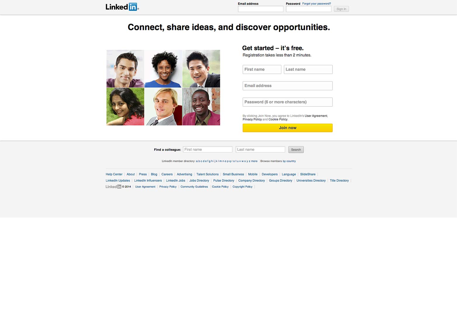 LinkedIn的注冊頁面就很好的說明了這一點。當你打開注冊頁面的時候,左側(cè)的用戶小頭像是極具目的性的,它向用戶展示了網(wǎng)站用戶的多樣性,并且傳遞出一個信息:這個網(wǎng)站真正是適合每個人的。這些照片中的人,種族背景不盡相同,有男有女,不包括老年人,并且每個人看起來自信而快樂。哪怕是不明白 社交網(wǎng)絡(luò)的人也能夠通過這個簡單的信息了解到這個星球上來自不同地域不同背景的人正匯聚于此,使用共同的服務(wù)一起交流 ,甚至業(yè)務(wù)往來。