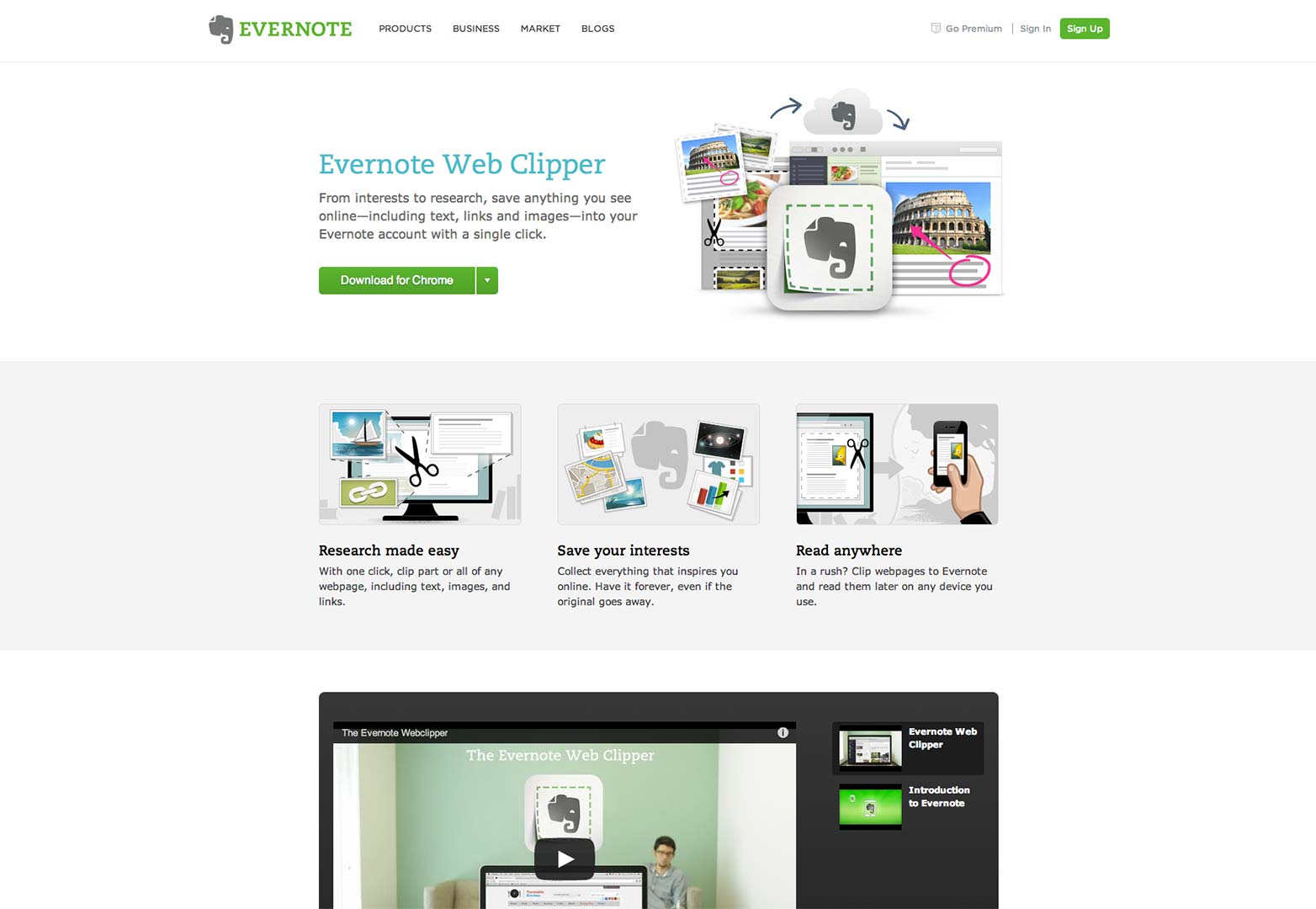 在Evernote Clipper的網(wǎng)頁中,我們看到了使用了偏向?qū)憣嵤址ǖ墓适玛U述方式。插畫與文字結(jié)合在一起,告訴用戶Web Clipper是如何工作的,看起來像故事書一樣簡單直白。