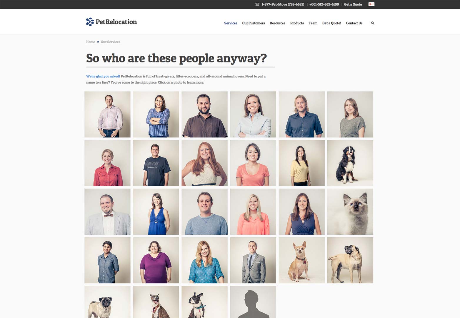 個性化讓你的品牌講述它偉大的故事。就以Pet Relocation為例子,在這個網(wǎng)站的團隊介紹頁面中,每個成員都倍受矚目,這與傳統(tǒng)的“關(guān)于我們”頁面有著巨大的差別。你會在頁面中看到團隊中每個人、每個寵物的微笑著的頭像,當你鼠標移動到頭像上的時候,頭像會變成更加個性化的樣子——更萌、更有趣。而這種設(shè)計正是要告訴訪客,這家機構(gòu)的企業(yè)文化 是講究放松和自然的。