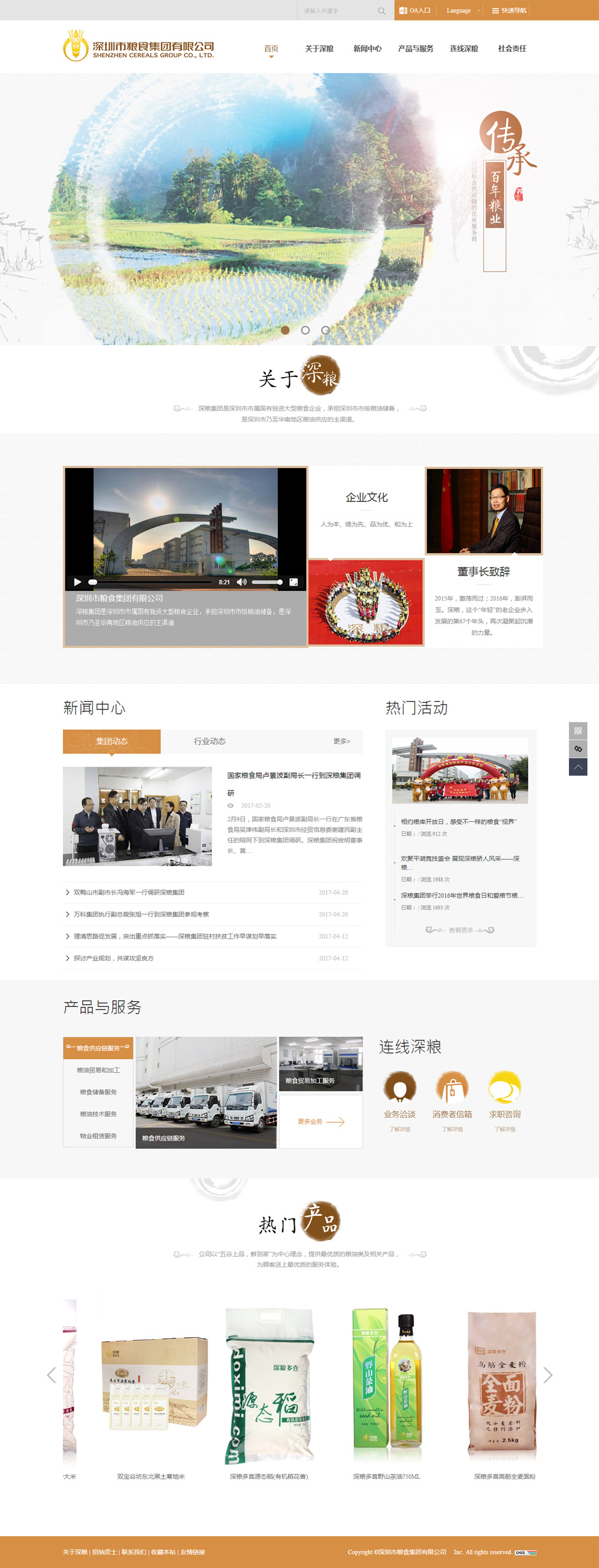 深糧集團是深圳市市屬國有獨資大型糧食企業(yè),是深圳市的“米袋子”,受政府委托,承擔我市市級地方糧食儲備,同時負責駐港、駐深部隊的軍糧供應任務。深糧集團前身是寶安縣糧食局,深圳特區(qū)成立后沿革為深圳市糧食局。1982年實行政企分開,改為企業(yè)建制。1984年率先在全國進行糧食流通體制改革。1998年經(jīng)公司制改造,更名為深圳市糧食集團有限公司。集團成功創(chuàng)立了“深糧多喜”、“多喜米”、“谷之香”、“君子蘭”、“紅荔”等品牌,被深圳市政府授予“放心糧油”稱號,年糧食購銷量130萬噸,約占深圳口糧市場份額的33%。