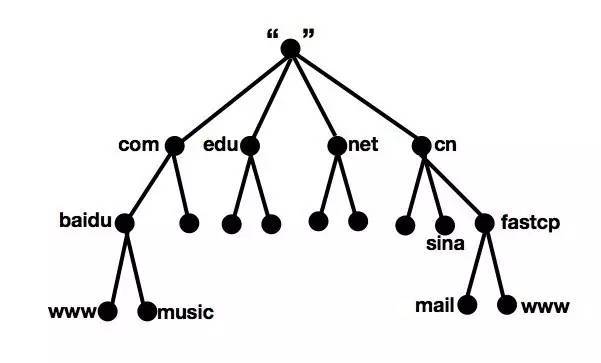 DNS 是以域名為索引的,域名是是由一串用“點”分隔的字符組成的Internet上某一臺計算機(jī)或計算機(jī)組的名稱,如下圖所示,域名的結(jié)構(gòu)為一顆倒立的樹,每個域名就是圖中的一個分支,這顆逆向樹就稱為域名空間。