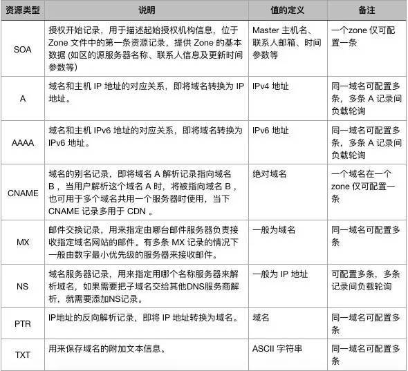常用資源類型包括 SOA、A、AAAA、CNAME、MX、NS、PTR、TXT等。