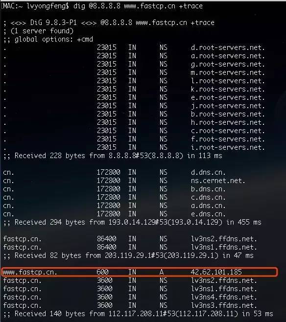 為看到實際效果,我在我本地完整請求一次 www.fastcp.cn ,來看看是否按照這個流程來給出結(jié)果,如下圖中使用 dig 工具的域名請求:
