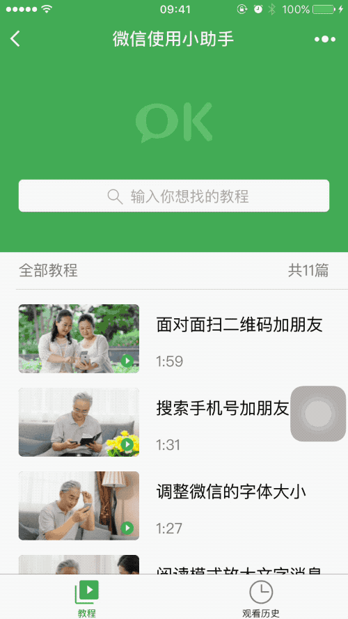 9 月 4 日,微信團(tuán)隊又推出一個實用的小程序 “微信使用小助手”,通過官方制作的一系列視頻及圖文教程,幫助咱們的父母更好地使用微信。