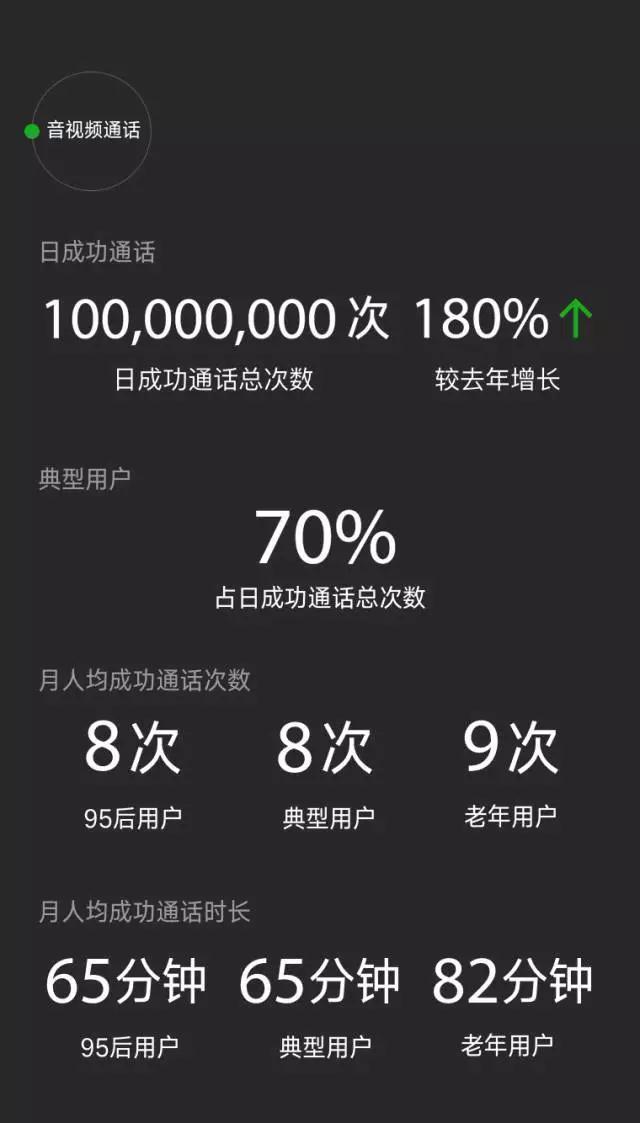 報告還顯示,微信的中老年用戶,平均每天發(fā)送 44 條消息,其中語言消息超過 1/5。在音視頻通話方面,老年用戶每月人均使用音視頻通話 9 次,人均時長達(dá)到 82 分鐘,超過 95 后以及 80、90 后典型用戶的 65 分鐘。在發(fā)紅包上,老年用戶每月人均發(fā)出 25 個紅包,金額為 380 元。