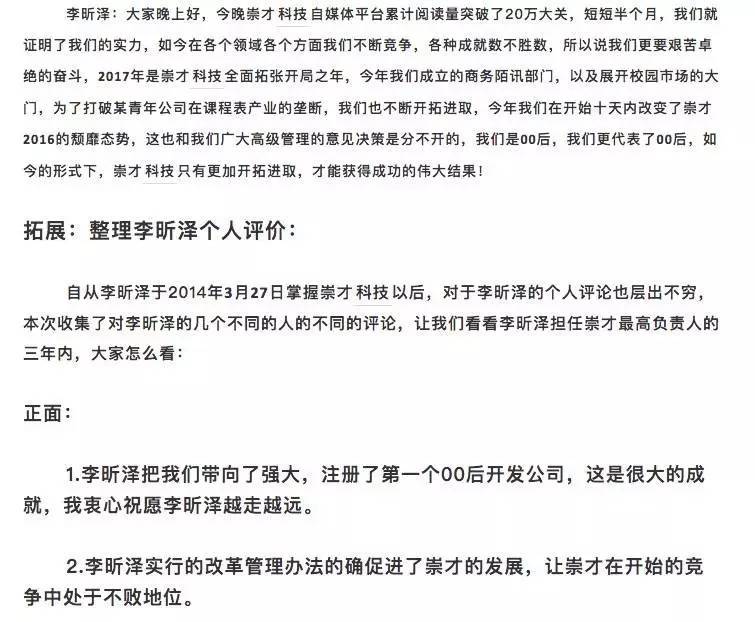 如果從產(chǎn)品、業(yè)務(wù)的角度來衡量崇才科技還不算一家成功的公司話,從品牌、公關(guān)的角度來看,李昕澤這么小的年紀(jì),能做到如此境界,已經(jīng)秒殺了不少公關(guān)公司。
