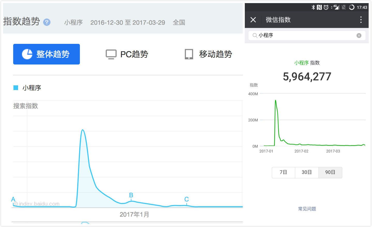 當(dāng)然,這樣的收緊策略也在一開始就影響了小程序的步伐。無論是百度指數(shù)還是微信指數(shù),數(shù)據(jù)都很直接的告訴我們,小程序的表現(xiàn)并不理想。發(fā)布之后迅速攀升,之后的熱度同樣消退的很快,這對(duì)一個(gè) MAU 9.63 億的產(chǎn)品來說是有些不盡如人意的。