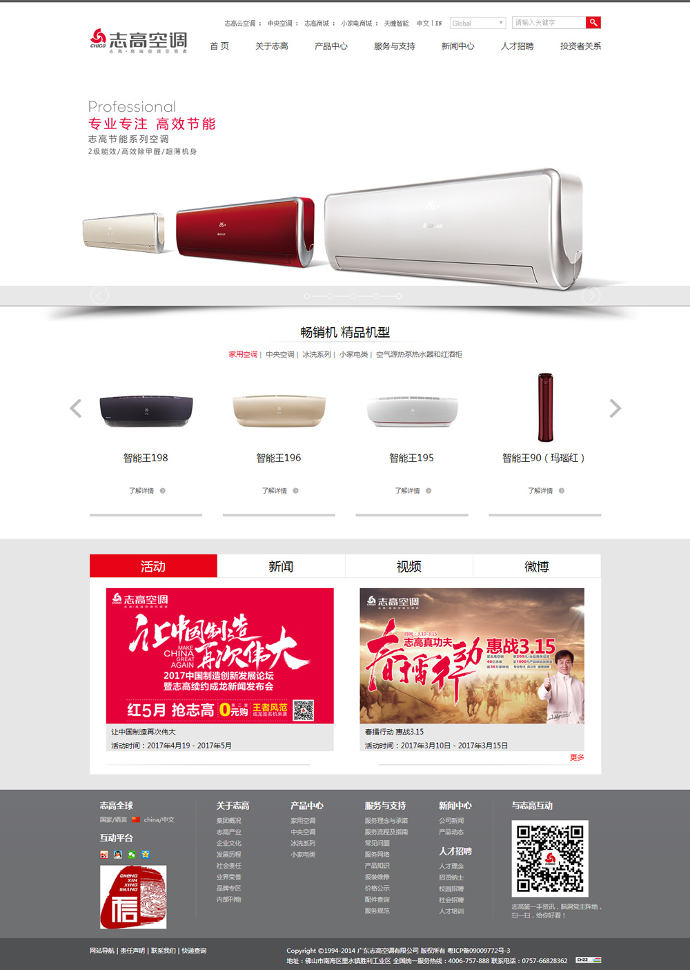 廣東志高空調(diào)有限公司創(chuàng)建于1994年,系香港聯(lián)合交易所主板上市公司志高控股(股份代號:00449.HK)旗下核心企業(yè),總部位于珠江三角洲工業(yè)重鎮(zhèn)佛山市南海區(qū),集團產(chǎn)業(yè)涵蓋家用空調(diào)、中央空調(diào)、冰箱、洗衣機、制冷設(shè)備、生活電器等領(lǐng)域。經(jīng)過20余年快速穩(wěn)健的發(fā)展壯大,公司現(xiàn)擁有佛山、九江、四會等生產(chǎn)基地,完整的空調(diào)配套產(chǎn)業(yè)鏈及物流中心,家用空調(diào)年設(shè)計產(chǎn)能達(dá)1000萬套,是國內(nèi)擁有包括壓縮機在內(nèi)的最大最完整集群式空調(diào)產(chǎn)業(yè)鏈企業(yè)之一,業(yè)務(wù)遍及全球200多個國家和地區(qū)。自2005年至今,志高空調(diào)一直穩(wěn)居行業(yè)前列。