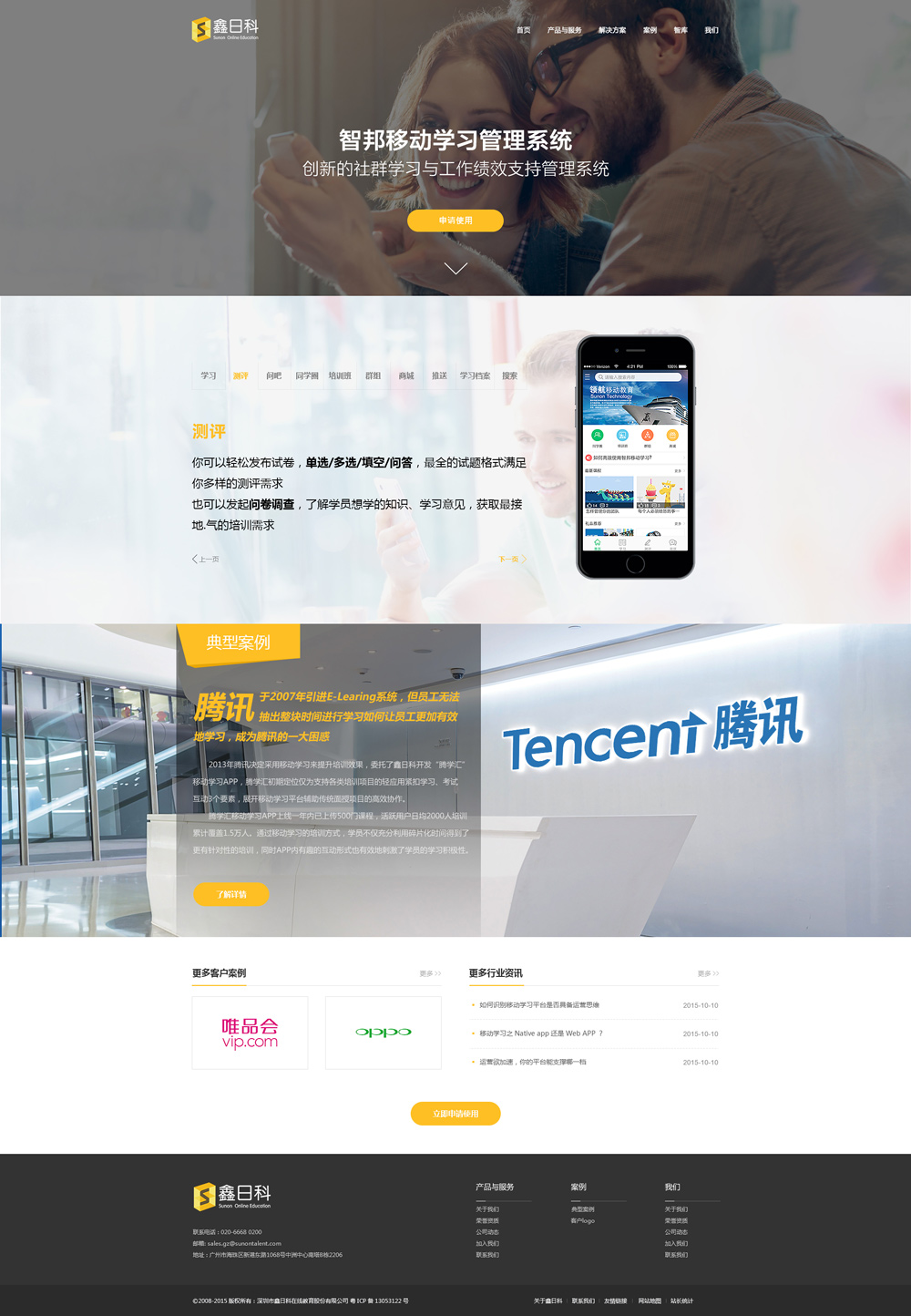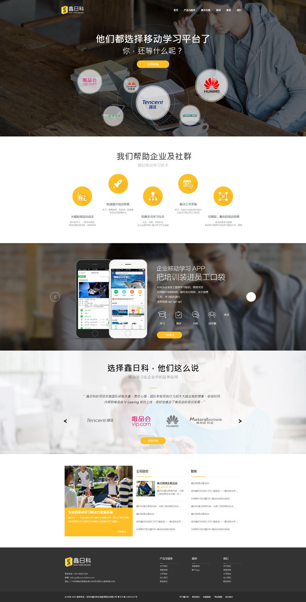 公司成立于2003年,注冊(cè)資金2100萬元,總部位于深圳,在香港、上海、廣州等地設(shè)立了分支機(jī)構(gòu),并在全國10多個(gè)城市建立營銷與服務(wù)網(wǎng)絡(luò)。創(chuàng)辦至今,鑫日科已為來自各個(gè)行業(yè)超過100家企業(yè)提供綜合性的在線學(xué)習(xí)解決方案:創(chuàng)新的移動(dòng)學(xué)習(xí)解決方案、輕量級(jí)的微信學(xué)習(xí)產(chǎn)品、全方位的在線學(xué)習(xí)管理系統(tǒng)、定制化的課件制作服務(wù)以及超過3000門的通用素質(zhì)類課件。